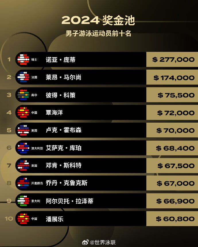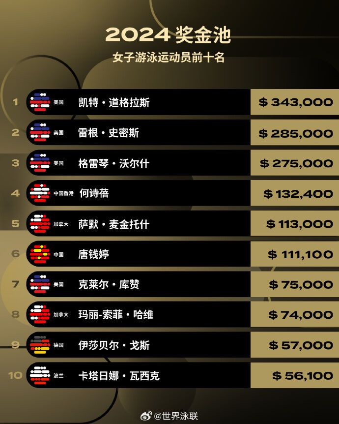 2024年,創(chuàng)紀(jì)錄的710萬美元獎(jiǎng)金被發(fā)放給319名游泳運(yùn)動(dòng)員——?jiǎng)?chuàng)下116年來的新高!中國(guó)運(yùn)動(dòng)員唐錢婷、覃海洋、潘展樂, 中國(guó)香港運(yùn)動(dòng)員何詩蓓躋身男女前十名行列。