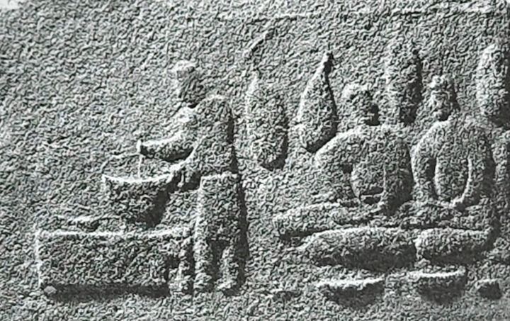 西漢揚(yáng)雄在《蜀都賦》中列舉了江東鮐鮑、隴西牛羊、糴米肥豬、山麇髓腦、水游之腴等五肉七菜,總結(jié)口味“調(diào)夫五味,甘甜之和,勺藥之羹”。食甜之余,還重食補(bǔ):“可以練神、養(yǎng)血?!钡玛柊芈℃?zhèn)出土的漢代畫像磚上,兩名庖丁伏案切割,一名廚師正在烹制,一手扶鍋似乎正翻鍋顛勺。