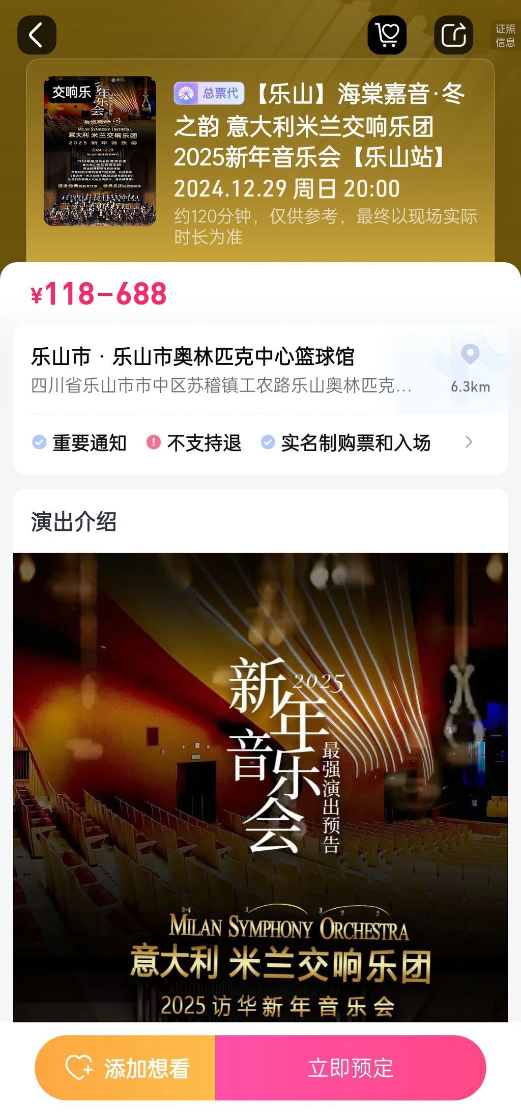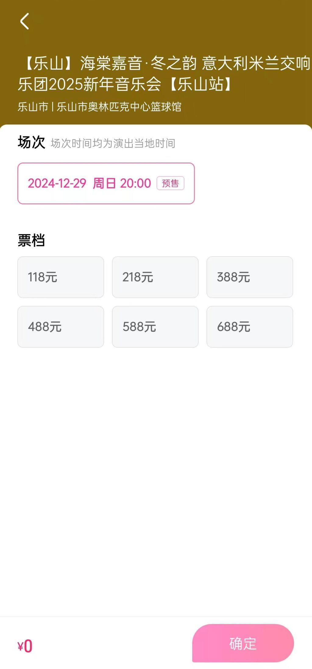 15時(shí),記者登錄大麥網(wǎng)手機(jī)APP,搜索本次新年音樂(lè)會(huì)信息,便可進(jìn)入購(gòu)票頁(yè)面。記者看到,門(mén)票預(yù)售共有6個(gè)價(jià)位,分別為118元、218元、388元、488元、588元、688元,為實(shí)名制購(gòu)票和入場(chǎng),觀眾購(gòu)票成功后無(wú)需取票,進(jìn)場(chǎng)時(shí)只需攜帶對(duì)應(yīng)證件。