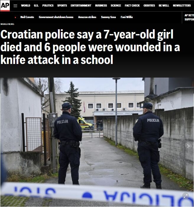 中新網(wǎng)12月20日電 據(jù)美聯(lián)社及路透社報(bào)道,當(dāng)?shù)貢r(shí)間12月20日,克羅地亞警方稱(chēng),該國(guó)首都薩格勒布一所小學(xué)發(fā)生一起持刀襲擊事件,造成一名7歲女童死亡,另有一名教師和5名學(xué)生受傷。