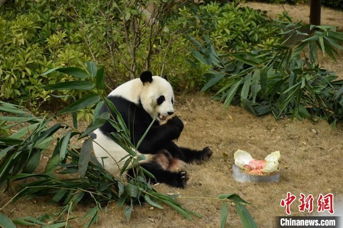 “明浜”誕生于日本,于2012年12月返回中國。2024年12月22日,柳州動物園為“壽星明浜”精心準備了18歲生日宴會,為“明浜”送上新鮮竹子和特制的“生日蛋糕”?!懊麂骸庇崎e地坐在草地上,敏捷地折斷竹子啃食起來,發(fā)出清脆的響聲。