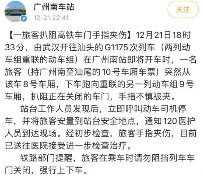 ·廣州南站通報(bào)“高鐵夾到乘客拖行”事件:乘客扒阻正關(guān)閉車門被夾傷手指,已送醫(yī)。
