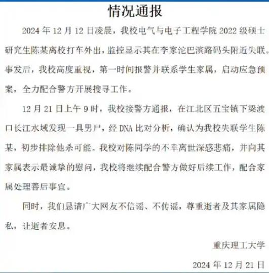 ·重慶理工大學(xué)通報(bào)一碩士失聯(lián):已發(fā)現(xiàn)尸體,初步排除他殺。