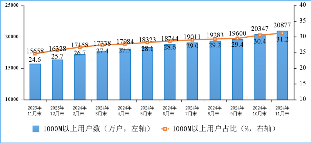 千兆用戶規(guī)模持續(xù)擴大。截至11月末,三家基礎電信企業(yè)的固定互聯(lián)網(wǎng)寬帶接入用戶總數(shù)達6.7億戶,比上年末凈增3379萬戶。其中,100Mbps及以上接入速率的固定互聯(lián)網(wǎng)寬帶接入用戶達6.35億戶,占總用戶數(shù)的94.8%;1000Mbps及以上接入速率的固定互聯(lián)網(wǎng)寬帶接入用戶達2.09億戶,比上年末凈增4549萬戶,占總用戶數(shù)的31.2%,占比較上年末提升5.5個百分點。在高速率用戶持續(xù)增長拉動下,家庭戶均接入帶寬達515.3Mbps/戶,同比增長15.1%。