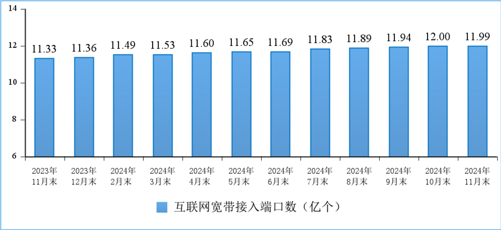 千兆光纖寬帶網(wǎng)絡建設持續(xù)推進。截至11月末,全國互聯(lián)網(wǎng)寬帶接入端口數(shù)量達12億個,比上年末凈增6360萬個。其中,光纖接入(FTTH/O)端口達到11.6億個,比上年末凈增6349萬個,占互聯(lián)網(wǎng)寬帶接入端口的96.5%。截至11月末,具備千兆網(wǎng)絡服務能力的10G PON端口數(shù)達2792萬個,比上年末凈增489.6萬個。