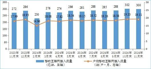 移動互聯(lián)網(wǎng)流量延續(xù)較快增勢,11月DOU值保持較高水平。前11個月,移動互聯(lián)網(wǎng)累計流量【見注1】達3066億GB,同比增長12%。截至11月末,移動互聯(lián)網(wǎng)用戶數(shù)【見注1】達15.68億戶,比上年末凈增4380萬戶。11月當月戶均移動互聯(lián)網(wǎng)接入流量(DOU)達到19.11GB/戶·月,同比增長5.9%,比上年同期提高1.07GB/戶·月。