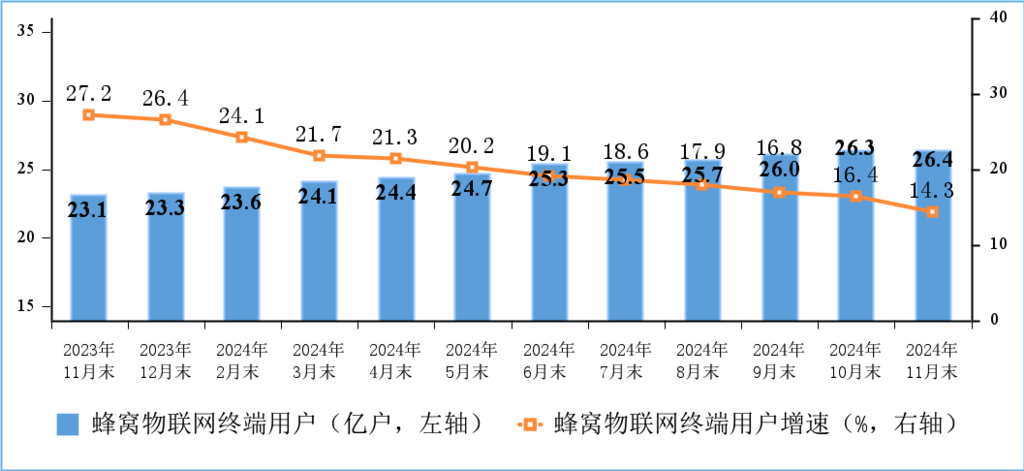 蜂窩物聯(lián)網(wǎng)用戶較快增長,IPTV(網(wǎng)絡電視)用戶穩(wěn)步增加。截至11月末,三家基礎電信企業(yè)發(fā)展蜂窩物聯(lián)網(wǎng)終端用戶26.42億戶,比上年末凈增3.1億戶,占移動網(wǎng)終端連接數(shù)(包括移動電話用戶和蜂窩物聯(lián)網(wǎng)終端用戶)的比重達59.6%。IPTV(網(wǎng)絡電視)總用戶數(shù)達4.08億戶,比上年末凈增666.5萬戶。