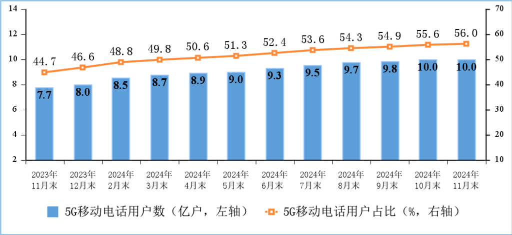 移動電話用戶規(guī)模穩(wěn)中有增,5G用戶數(shù)突破10億戶。截至11月末,三家基礎電信企業(yè)及中國廣電的移動電話用戶總數(shù)【注1】達17.9億戶,比上年末凈增4682萬戶。其中,5G移動電話用戶達10.02億戶,比上年末凈增1.8億戶,占移動電話用戶的56%,占比較上年末提高9.4個百分點。