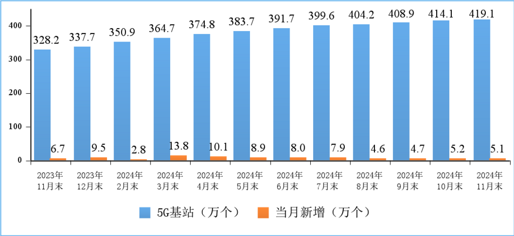 5G網(wǎng)絡建設有序推進。截至11月末,5G基站總數(shù)達419.1萬個,比上年末凈增81.5萬個,占移動基站總數(shù)的33.2%,占比較上年末提高4.1個百分點。