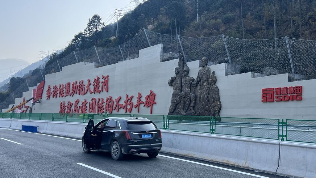 瀘石高速石棉段沿線圍繞“弘揚長征精神、傳承紅色文化、走好新長征路”主題,借助沿線隧道洞門洞內(nèi)、場地綠化、標志性構(gòu)筑物等,打造紅色文化路域景觀。例如,沿線就以浮雕形式展現(xiàn)了“強渡大渡河”“彝海結(jié)盟”等紅色文化主題。