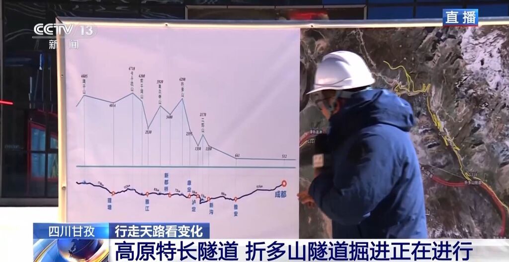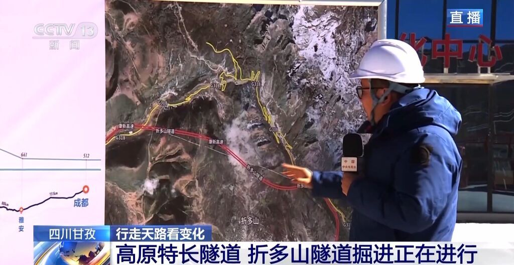 總臺記者 陳凱:這張圖會對新老的川藏線有一個更加明顯認(rèn)識,黃色的線是老318線,在這里需要在高海拔地區(qū)蜿蜒曲折去翻越折多山,但這條紅色是正在修建的折多山隧道,這條長約八千米的隧道可以大大減少通行折多山的時間,通行時間從1.5小時至2小時縮短到8至10分鐘,所以說這條隧道在修建的時候,就受到了很多人的關(guān)注,大家都關(guān)心這個隧道什么時候能夠通車。