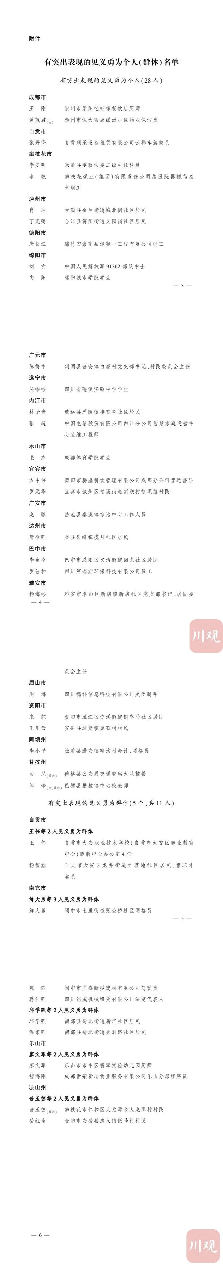 2023年以來(lái),全省上下堅(jiān)持以習(xí)近平新時(shí)代中國(guó)特色社會(huì)主義思想為指導(dǎo),積極踐行社會(huì)主義核心價(jià)值觀,在全面建設(shè)社會(huì)主義現(xiàn)代化四川新征程上,涌現(xiàn)出一批有突出表現(xiàn)的見(jiàn)義勇為個(gè)人(群體)。他們?cè)诠怖婧腿嗣袢罕娚?cái)產(chǎn)安全受到危害的緊急關(guān)頭,挺身而出、扶危救困,書(shū)寫(xiě)了以平凡之軀行英雄之舉的感人篇章。為弘揚(yáng)正氣、鼓勵(lì)先進(jìn)、樹(shù)立榜樣,根據(jù)《四川省保護(hù)和獎(jiǎng)勵(lì)見(jiàn)義勇為條例》,省政府決定對(duì)王剛等有突出表現(xiàn)的28名見(jiàn)義勇為個(gè)人、5個(gè)見(jiàn)義勇為群體給予獎(jiǎng)勵(lì)。