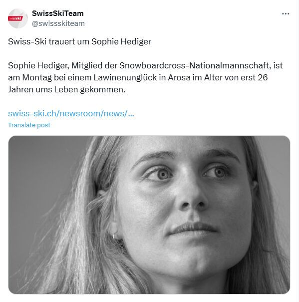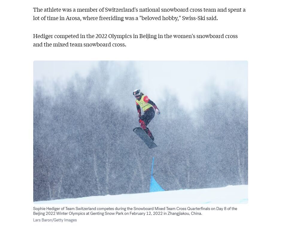 當地時間24日晚,瑞士滑雪聯合會確認了這一消息,并向索菲·赫迪格表示哀悼。首席執(zhí)行官沃爾特·魯瑟表示,“感到震驚也非常悲傷,我們的心與索菲的家人同在,向他們表示最深切的哀悼?!?/p>