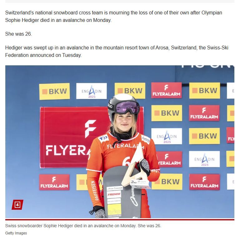 據多家外媒報道,瑞士國家隊單板滑雪運動員索菲·赫迪格在當地時間12月23日的一場雪崩事故中不幸身亡,年僅26歲。意外發(fā)生時,她剛剛過完自己的26歲生日。