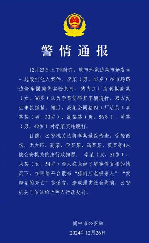 ·四川閬中警方辟謠網(wǎng)傳豬肉店老板殺人:2人散布謠言被罰。