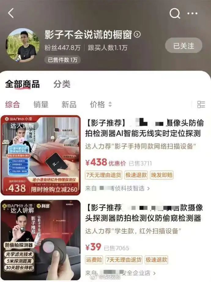 “影子不會說謊”的抖音賬號首頁視頻封面仍能正常顯示,但點擊后已無法播放,其主頁商品櫥窗里掛著防偷拍檢測器。