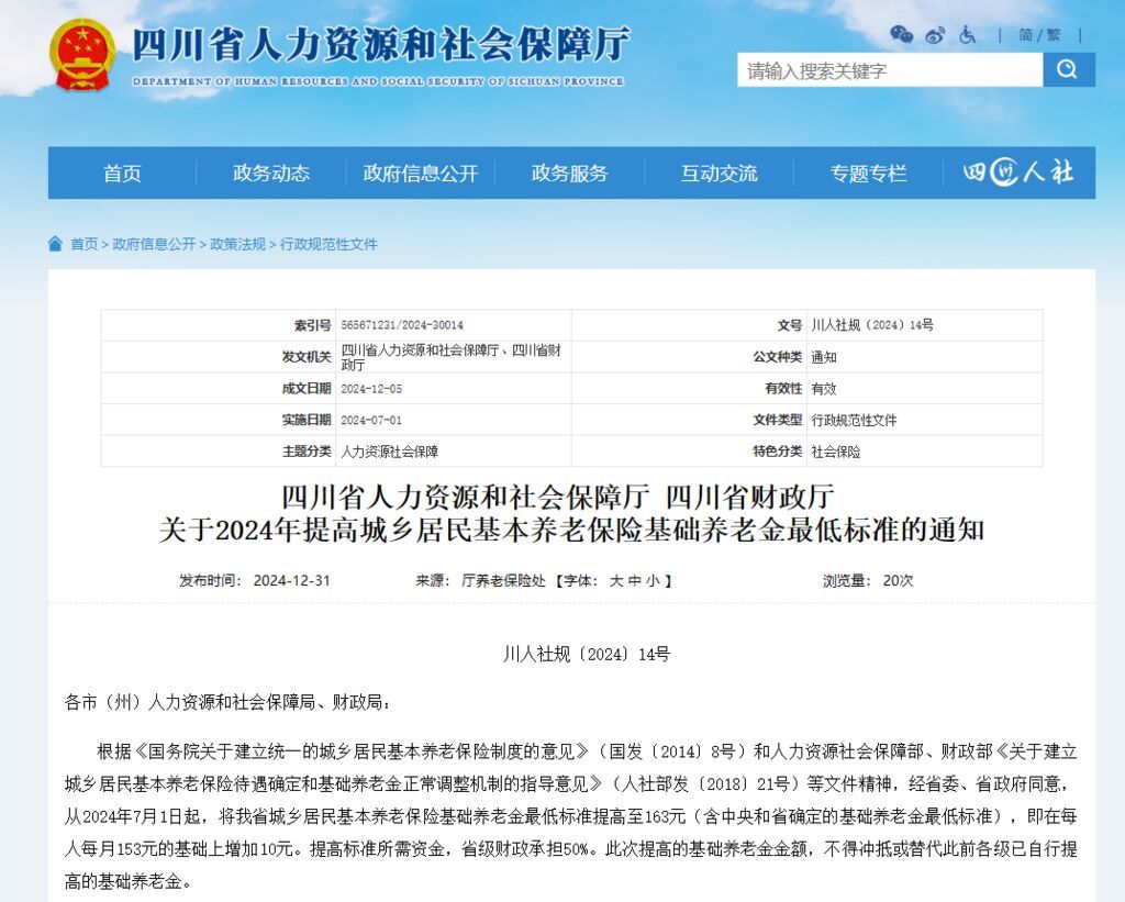 12月31日,四川省人力資源和社會保障廳官網(wǎng)公布關(guān)于2024年提高城鄉(xiāng)居民基本養(yǎng)老保險基礎(chǔ)養(yǎng)老金最低標準的通知。根據(jù)國務(wù)院和人力資源社會保障部、財政部相關(guān)精神,經(jīng)省委、省政府同意,從2024年7月1日起,將四川省城鄉(xiāng)居民基本養(yǎng)老保險基礎(chǔ)養(yǎng)老金最低標準提高至163元(含中央和省確定的基礎(chǔ)養(yǎng)老金最低標準),即在每人每月153元的基礎(chǔ)上增加10元。此次提高的基礎(chǔ)養(yǎng)老金金額,不得沖抵或替代此前各級已自行提高的基礎(chǔ)養(yǎng)老金。