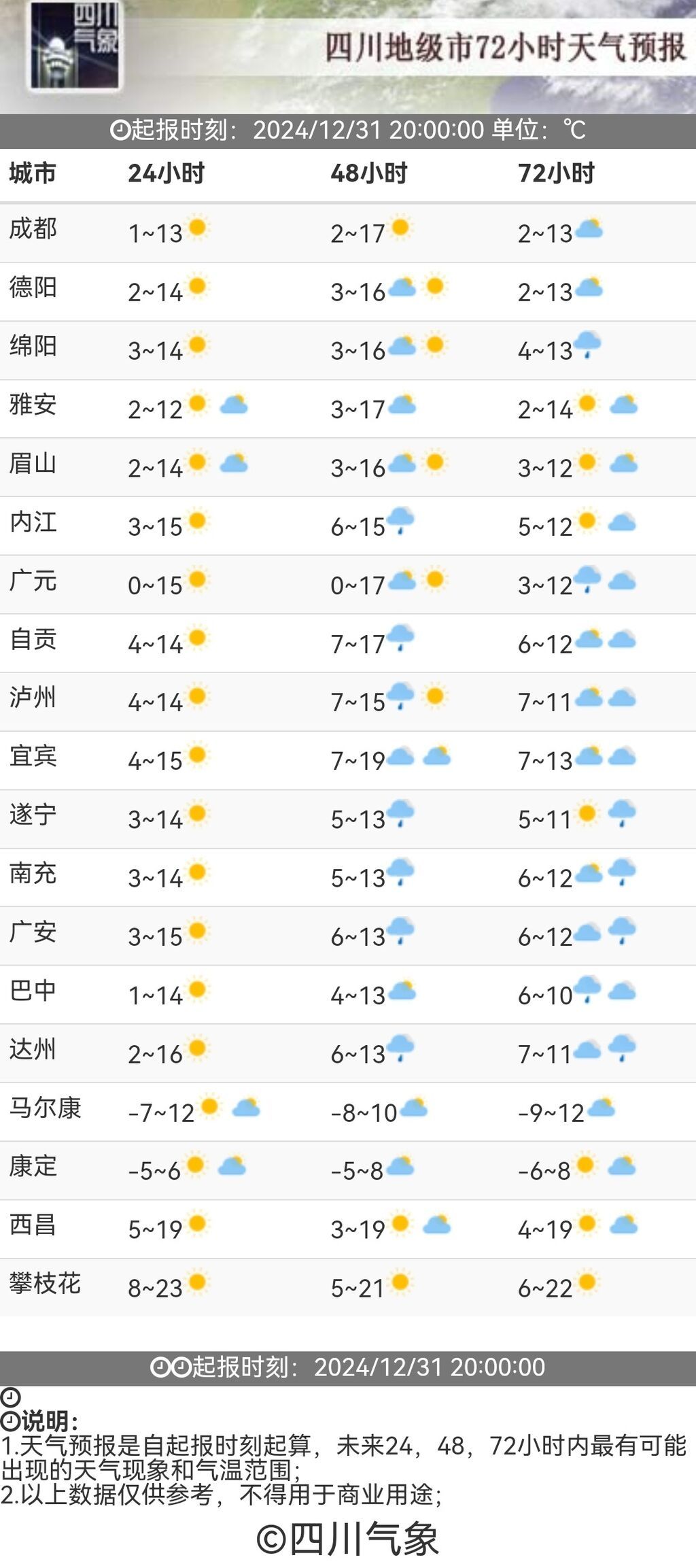 四川省氣象臺預計,1月1日晚上至3日白天,川西高原和攀西地區(qū)天氣依舊晴好;陽光將從盆地部分城市暫時撤離。