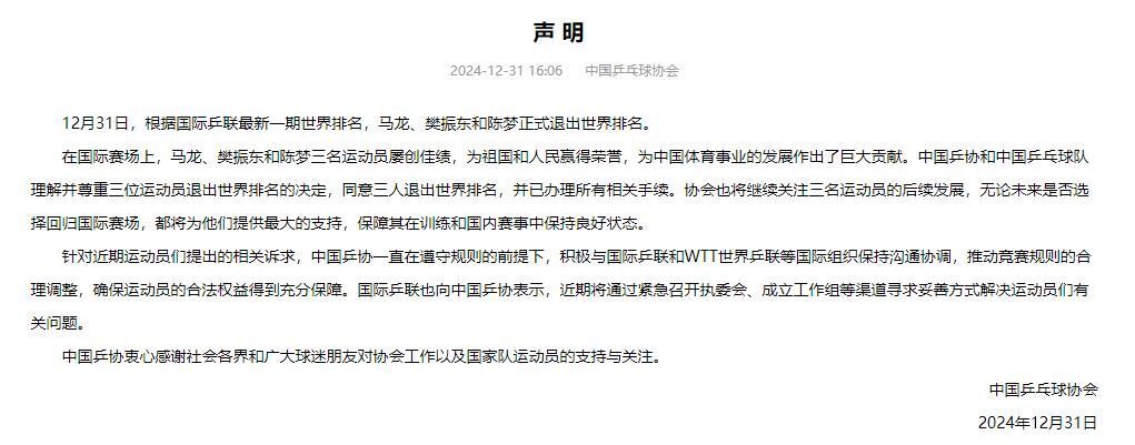 ·中國乒協(xié):同意馬龍、樊振東和陳夢(mèng)退出世界排名,已辦理所有相關(guān)手續(xù)。