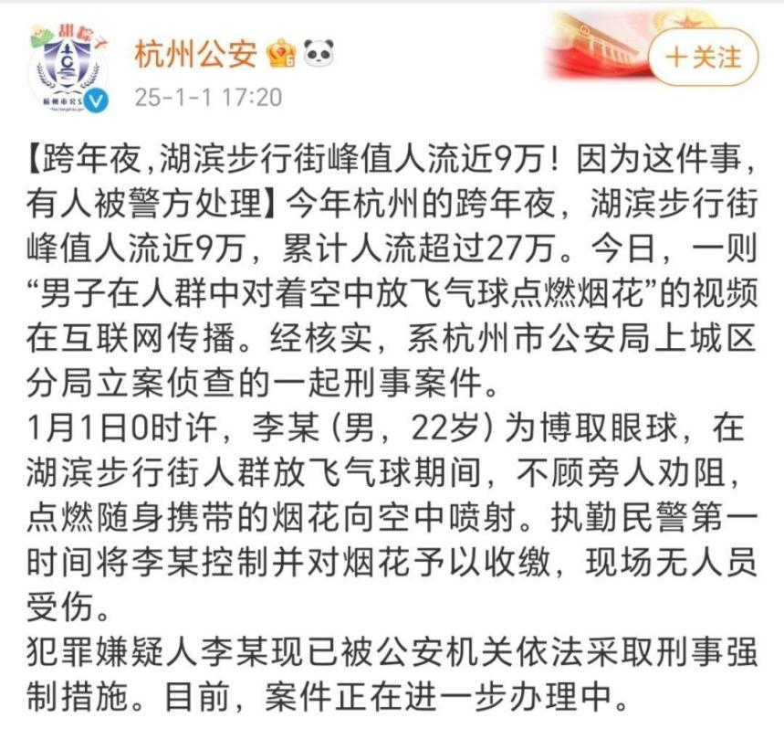 ·跨年夜一男子在人群放飛氣球時點燃煙花噴射,杭州警方通報。