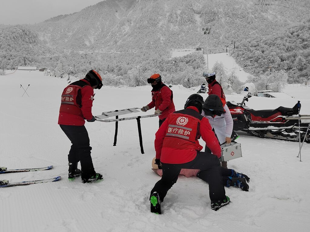 在雪場中級道上,一名游客突然摔倒,膝蓋部位的扭傷讓他痛苦不已。雪道的安全員發(fā)現(xiàn)后立即使用對講機(jī)尋求支援,2分鐘后,幾名身穿紅衣的滑雪巡救員腳踩雪板,迅速滑行至受傷游客身邊。經(jīng)過一番緊急雪上救護(hù)處理后,用擔(dān)架快速安全地將受傷游客抬到醫(yī)務(wù)室,接受進(jìn)一步救治。