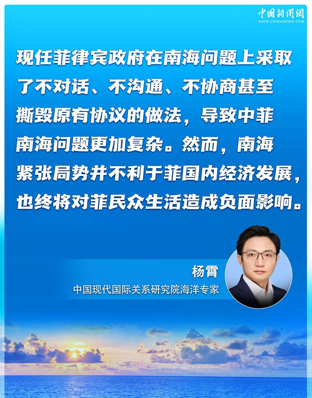 楊霄進一步指出,現(xiàn)任菲律賓政府在南海問題上采取了不對話、不溝通、不協(xié)商甚至撕毀原有協(xié)議的做法,導(dǎo)致中菲南海問題更加復(fù)雜。然而,南海緊張局勢并不利于菲國內(nèi)經(jīng)濟發(fā)展,也終將對菲民眾生活造成負面影響。
