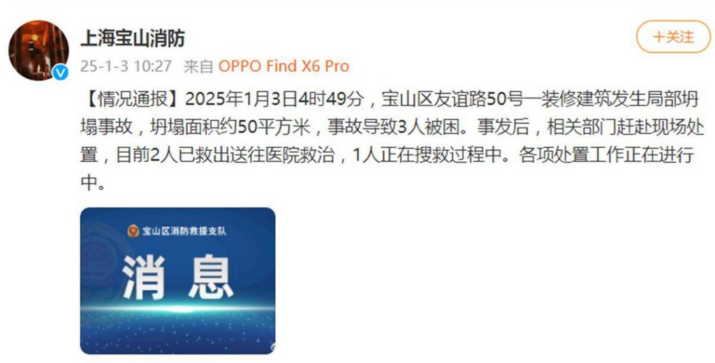 ·上海一建筑凌晨發(fā)生坍塌致3人被困,消防通報(bào):2人已救出送醫(yī)。
