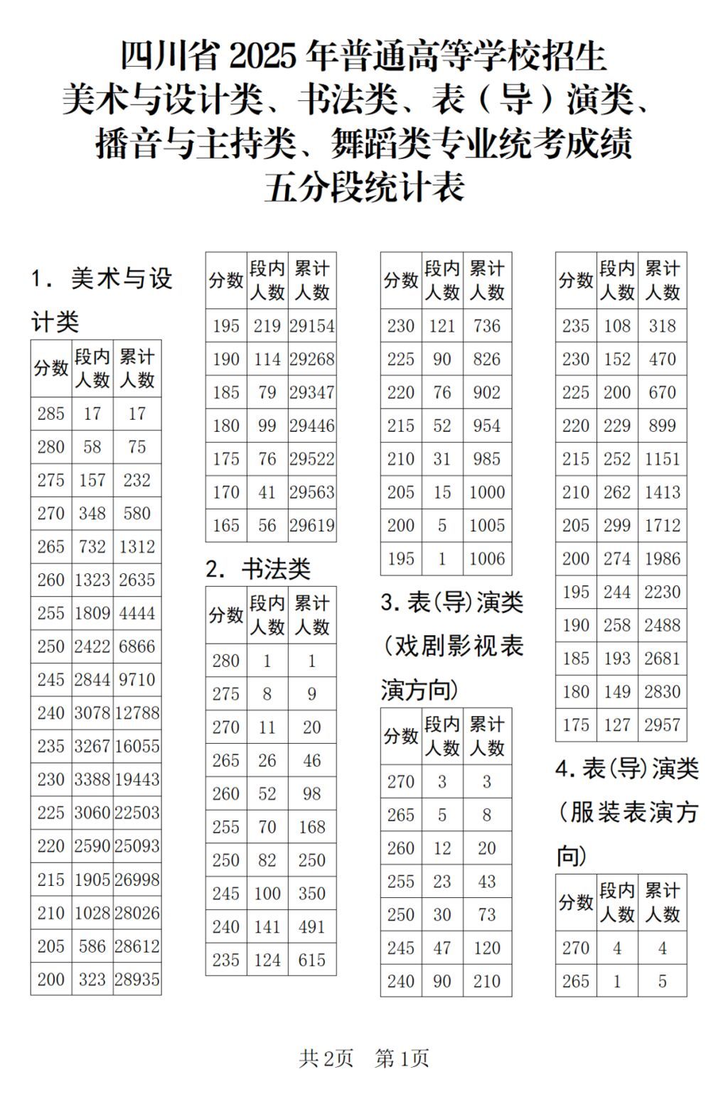 四川省2025年普通高校招生藝術(shù)類專業(yè)統(tǒng)考合格線已經(jīng)省招考委劃定。為便于考生和組織專業(yè)校考的招生學(xué)校了解專業(yè)統(tǒng)考成績分布情況,現(xiàn)公布專業(yè)統(tǒng)考成績達(dá)到合格線的考生專業(yè)總分五分段統(tǒng)計(jì)表,供考生和招生學(xué)校查閱。