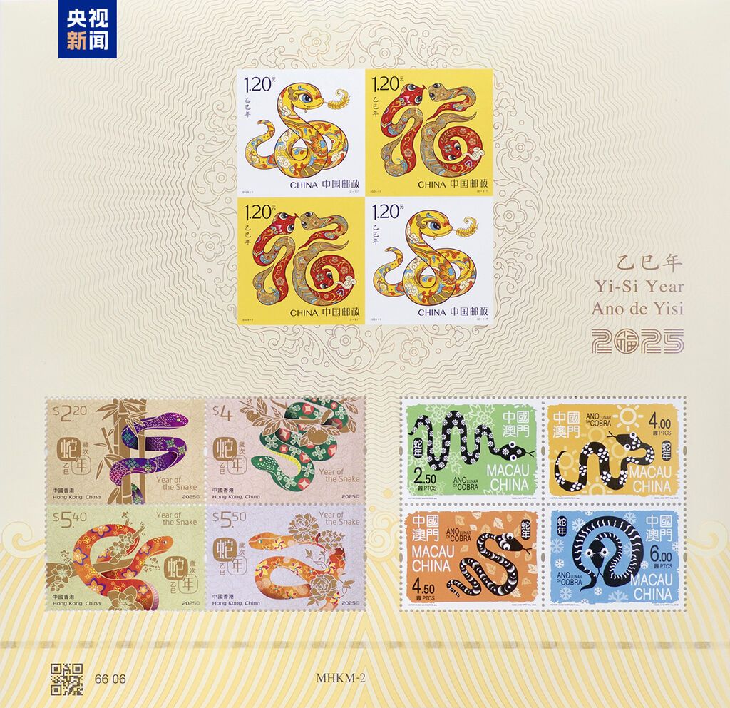 今天,中國郵政發(fā)行了《乙巳年》特種郵票,這也是我國發(fā)行的第四輪生肖郵票。此外,中國郵政和香港、澳門郵政部門共同印制的生肖同題材郵票三地小全張今日同步發(fā)行。