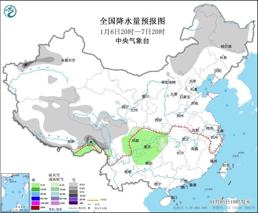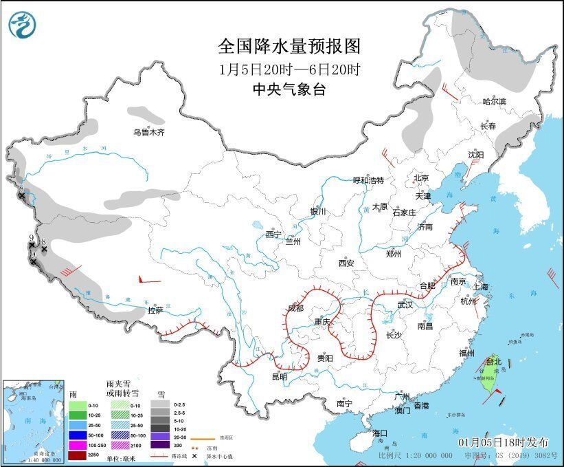 1月5日20時至6日20時,內(nèi)蒙古中東部、黑龍江中北部、吉林東部、新疆南疆盆地和南疆西部山區(qū)、西藏西部等地部分地區(qū)有小到中雪,其中,新疆南疆西部山區(qū)、西藏西部等地部分地區(qū)有大雪(5~9毫米),局地暴雪。臺灣島等地部分地區(qū)有小雨。內(nèi)蒙古中東部、遼東半島、山東半島、江南東部等地部分地區(qū)有4~6級風(fēng)(見圖1)。