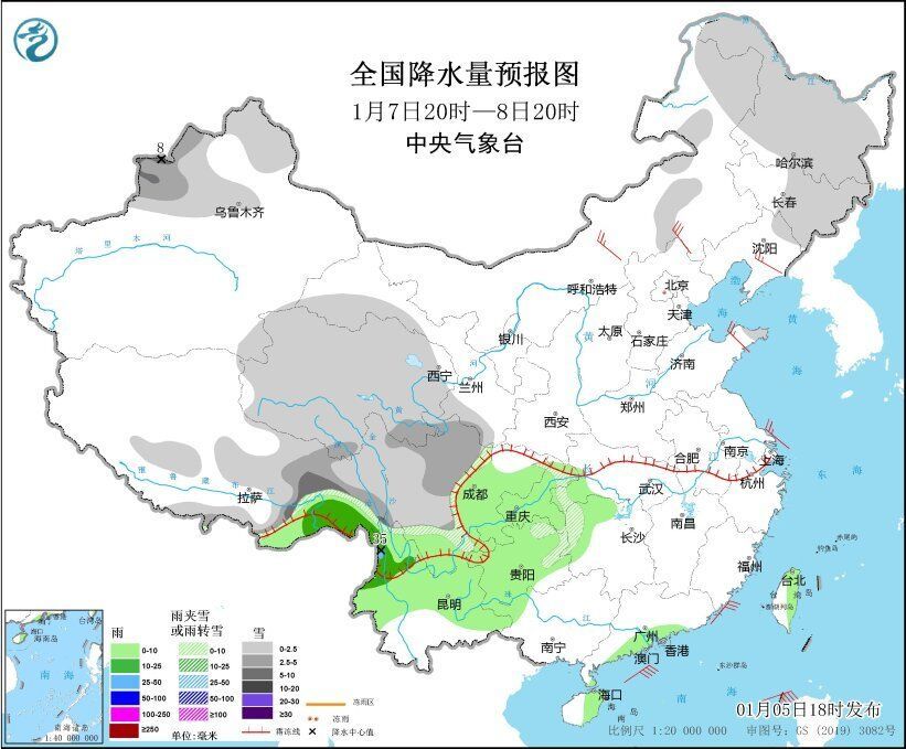 1月7日20時至8日20時,內(nèi)蒙古東北部、黑龍江、吉林、新疆北部、西藏東部、西北地區(qū)中部、西南地區(qū)北部等地部分地區(qū)有小雪或雨夾雪,其中,新疆北疆北部和伊犁河谷、西藏東部、青海南部、川西高原北部等地部分地區(qū)有中到大雪(5~8毫米)。西藏東部、西南地區(qū)東部和南部、廣東西南部沿海、海南島等地部分地區(qū)有小到中雨,其中,云南西北部等地部分地區(qū)有大雨(25~35毫米)。內(nèi)蒙古中部、遼寧東部、山東半島等地部分地區(qū)有4~6級風(fēng)(見圖3)。