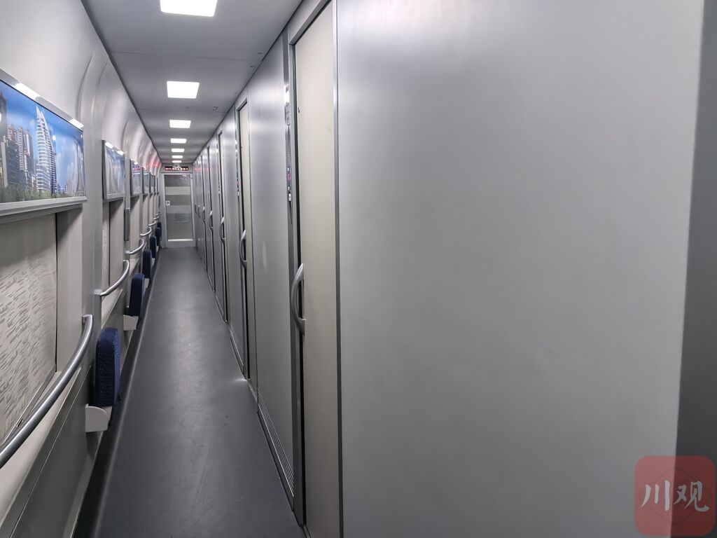 該列車共16節(jié)車廂,設有臥鋪車廂、餐吧車及二等車廂。其中兩個頭車(01車和16車)是二等座車,每個車廂有55個二等座椅;餐車設在8車,設有廚房、吧臺及餐桌。其余車廂均為臥鋪車廂,共設置520個鋪位,其中,每個車廂設置10個包間,每個包間4個鋪位,并設置獨立包間門。臥鋪車廂過道沿設置邊座,可供旅客乘坐以觀賞沿途風景。