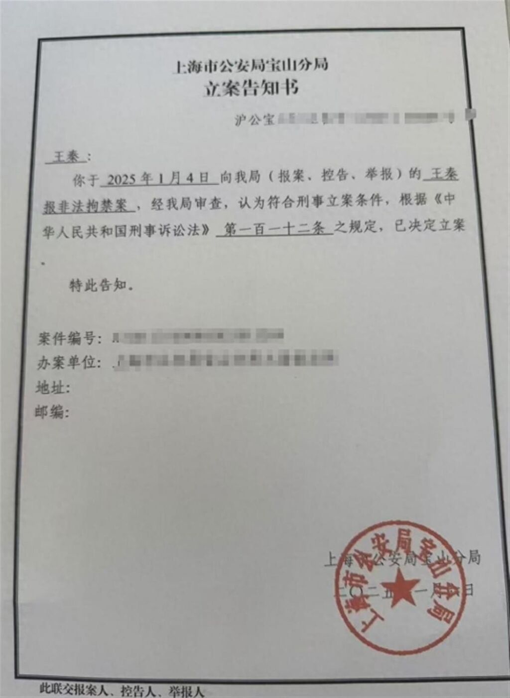另據(jù)潮新聞報道,1月6日,關于中國內(nèi)地演員王星失聯(lián)于泰緬交界處的消息由其女友嘉嘉發(fā)布后,引發(fā)網(wǎng)友熱議。當天,潮新聞記者與王星好友泡芙(化名)以及其弟弟王秦取得聯(lián)系,王秦向記者確認王星失聯(lián)一事已正式立案。泡芙提供的上海市公安局寶山分局立案告知書顯示,王秦所報的非法拘禁案,經(jīng)審查,認為符合刑事立案條件,已決定立案。