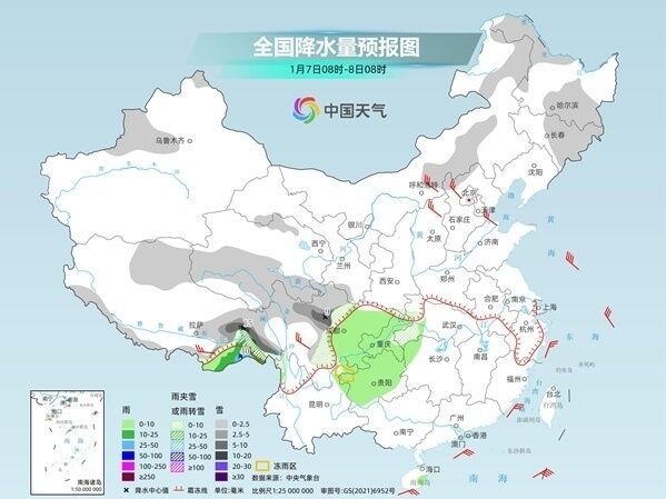 今后三天(1月7日至9日),冷空氣將給中東部大部和西南地區(qū)帶來明顯降溫,多地氣溫將創(chuàng)立冬后新低。同時,南方降水將逐漸向東擴展增多,并波及江南西部等地,四川、貴州、重慶、湖北、湖南等地將經(jīng)歷雨雪轉(zhuǎn)換,局地需警惕凍雨。