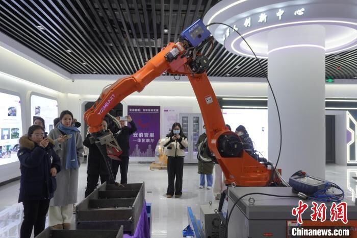 在清智(鄭州)機(jī)器人創(chuàng)新中心展廳,一臺(tái)免示教焊接機(jī)器人的“眼睛”閃著光,正在模擬焊接作業(yè)。