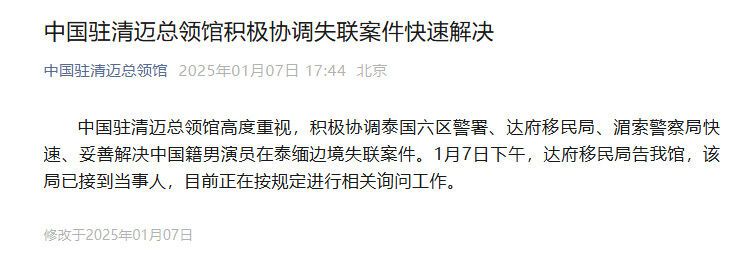 當(dāng)?shù)貢r(shí)間1月7日,總臺(tái)記者從中國(guó)駐清邁總領(lǐng)館得到消息,泰國(guó)湄索移民局表示,已找到失聯(lián)的中國(guó)演員。中國(guó)駐清邁總領(lǐng)館正聯(lián)系湄索警方了解下一步安排。