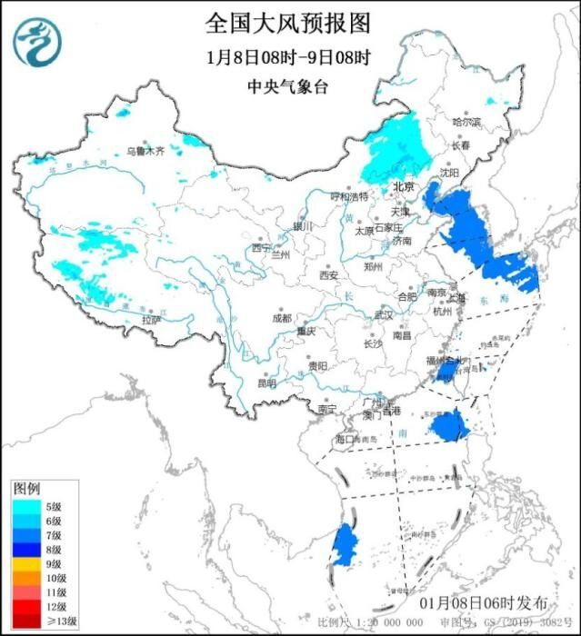 受冷空氣影響,8日至9日,中東部大部及新疆北部、青藏高原東部等地將有4~6℃降溫,局地降溫8℃以上。8日08時(shí)至9日08時(shí),內(nèi)蒙古中東部、河北北部、遼寧西北部及西藏中西部等地部分地區(qū)將有5~6級(jí)、陣風(fēng)7~8級(jí)的大風(fēng);渤海、渤海海峽、黃海大部海域、東海東北部海域、臺(tái)灣海峽、南海東北部和西南部偏西海域、巴士海峽偏西海域?qū)⒂?級(jí)、陣風(fēng)8~9級(jí)的偏北到東北風(fēng)(見圖1)。中央氣象臺(tái)1月8日06時(shí)繼續(xù)發(fā)布大風(fēng)藍(lán)色預(yù)警。