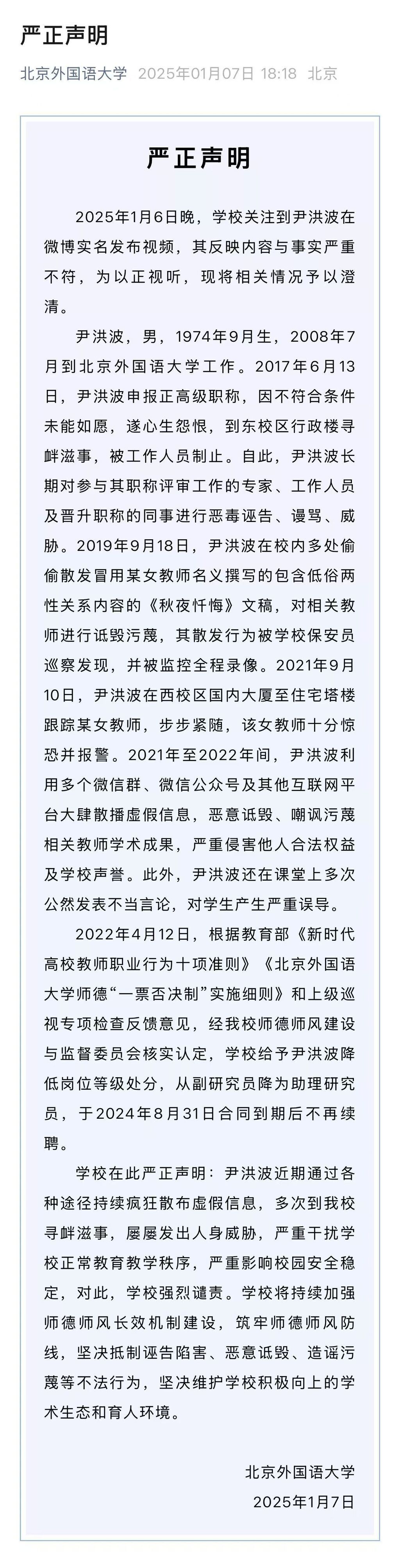1月7日,就尹洪波相關(guān)問題,北京外國語大學(xué)發(fā)布嚴(yán)正聲明。全文如下:
