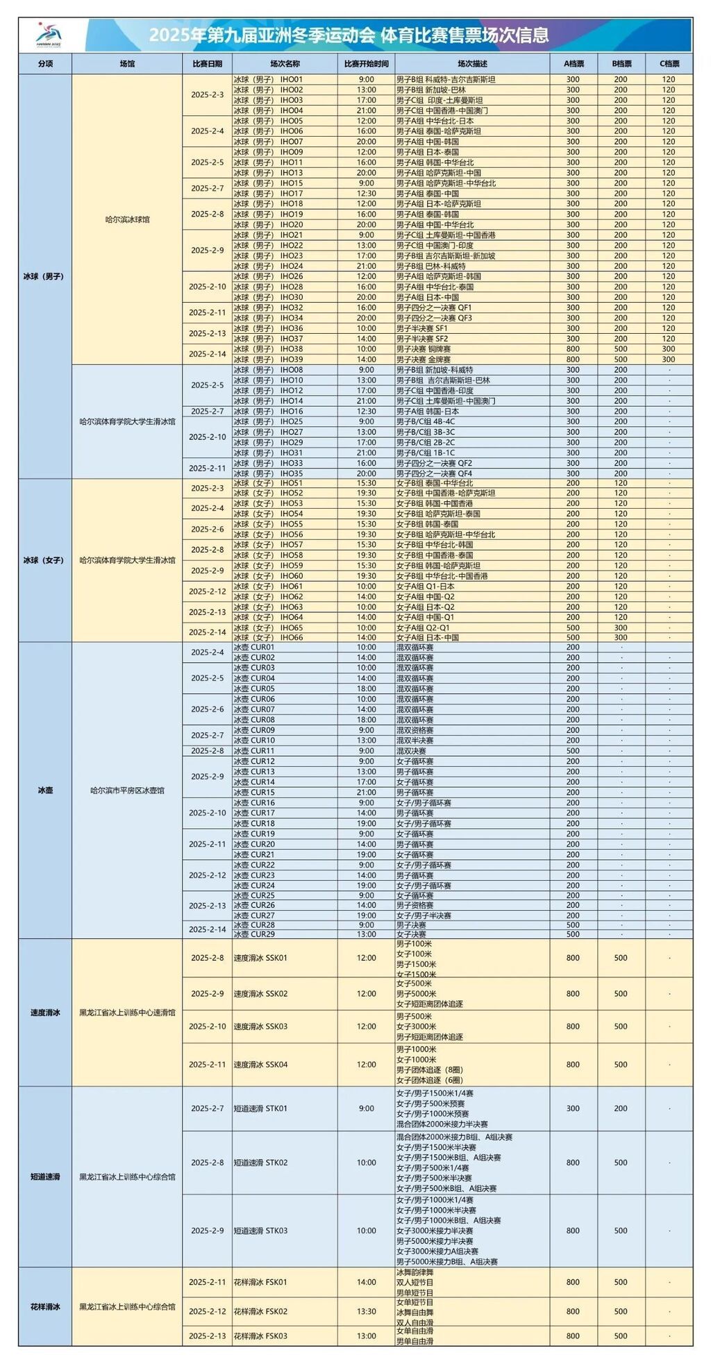 銷售的門票包括了亞冬會(huì)全部冰上比賽項(xiàng)目:冰球、速度滑冰、短道速滑、花樣滑冰和冰壺,共94個(gè)場(chǎng)次。