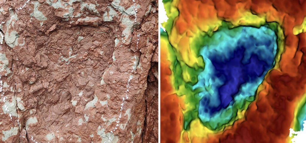 另有一處遺跡化石是由3個(gè)連續(xù)的、長度平均約42厘米的獸腳類恐龍足跡構(gòu)成的一條行跡。研究人員判斷其為實(shí)雷龍的足跡。這種中型肉食性恐龍?bào)w長可能達(dá)6米。