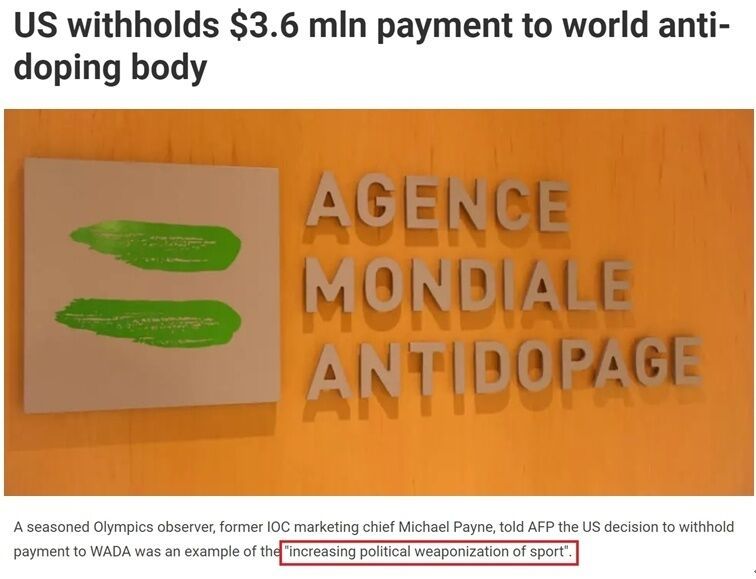 國(guó)際奧委會(huì)前市場(chǎng)部主任邁克爾·佩恩對(duì)媒體表示,美國(guó)拒繳WADA會(huì)費(fèi),是體育被進(jìn)一步“政治化、武器化”的例證。