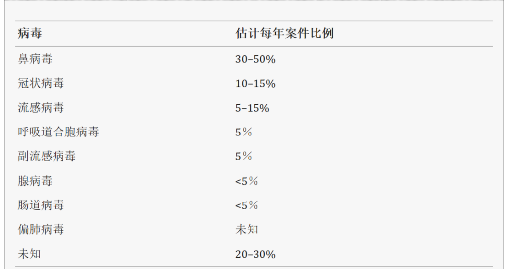 近年來,隨著檢測技術(shù)的不斷進步,尤其是PCR等分子檢測技術(shù)的普及,臨床樣本中病毒的檢出率大大提高,使我們發(fā)現(xiàn),原來造成感冒的病原體,以及其比例如下: