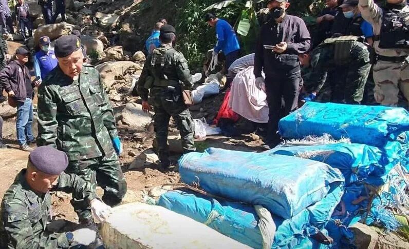 泰國軍隊連夜確保該地區(qū)安全后,于黎明時分進行搜查,并發(fā)現(xiàn)大量毒品,以及四名走私嫌疑犯彈孔累累的尸體。