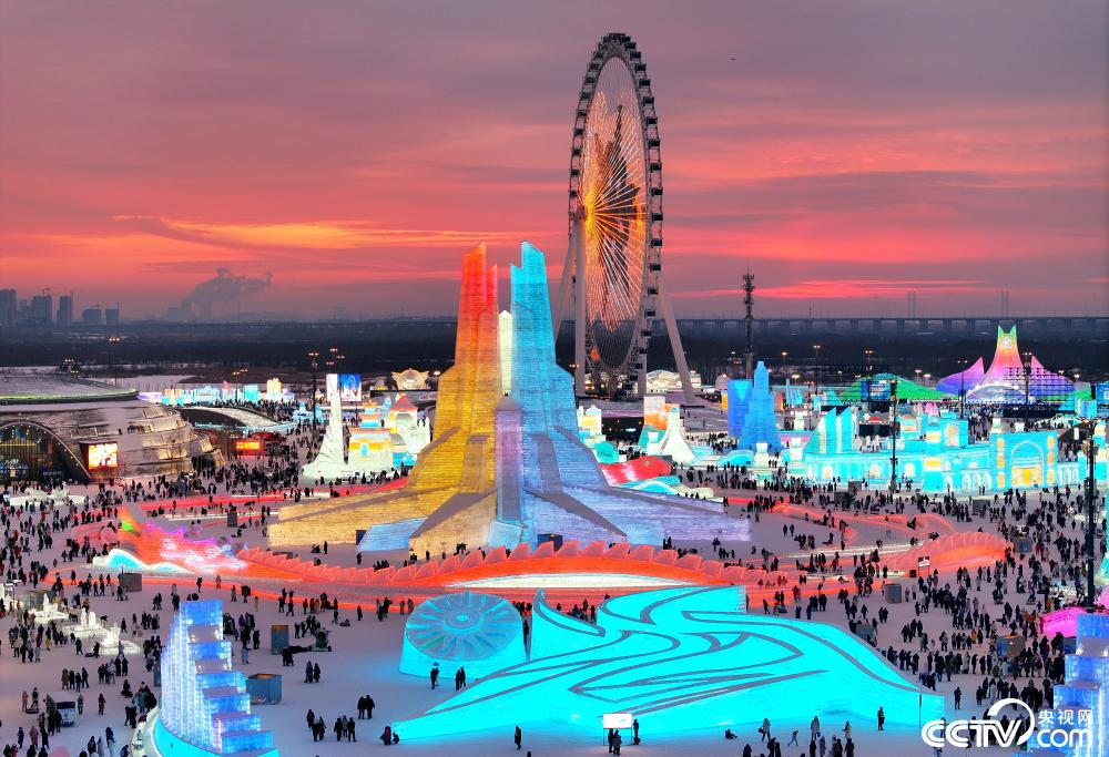 1月15日,哈爾濱冰雪大世界園區(qū)在晚霞的輝映下愈加璀璨奪目。