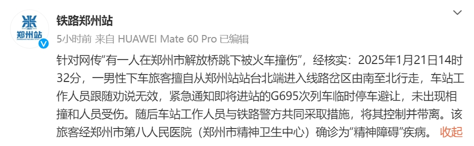 ·官方辟謠“鄭州一人跳橋被火車撞亡”:系精神疾病患者擅闖鐵路線,未相撞、無傷亡。