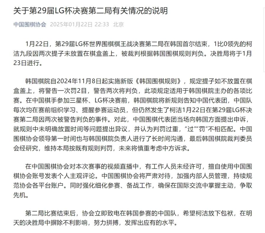 ·中國圍棋協(xié)會回應(yīng)柯潔因兩次提子未放置在棋盒蓋上被判負:當場向韓方提出申訴。