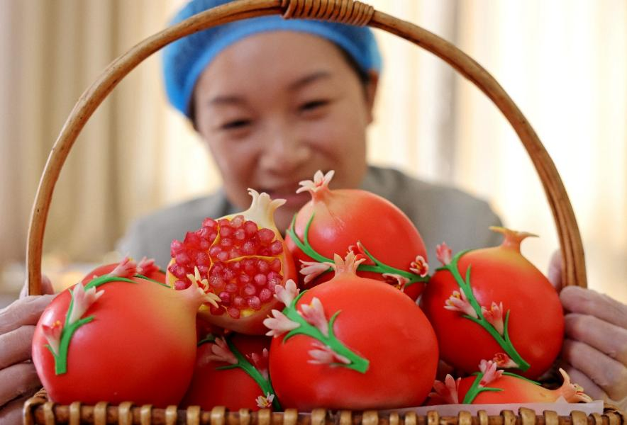 1月22日,北方小年,在山東省棗莊市,民間藝人用面粉、果蔬汁等食材制作的“紅石榴”喜饃,吉祥納新,紅紅火火過小年。
