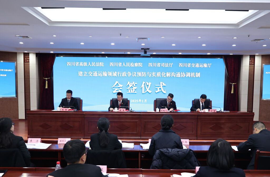 1月21日,四川省交通運輸領域行政管理、行政復議、行政審判、行政檢察院廳聯(lián)席會議首次召開,省法院、省檢察院、司法廳、交通運輸廳共同建立交通運輸領域行政爭議預防與實質(zhì)化解溝通協(xié)調(diào)機制,院廳聯(lián)手,有效預防和化解行政爭議。