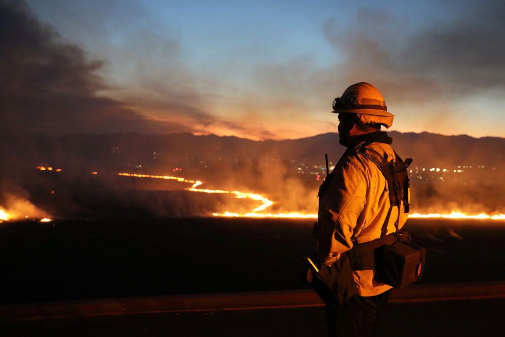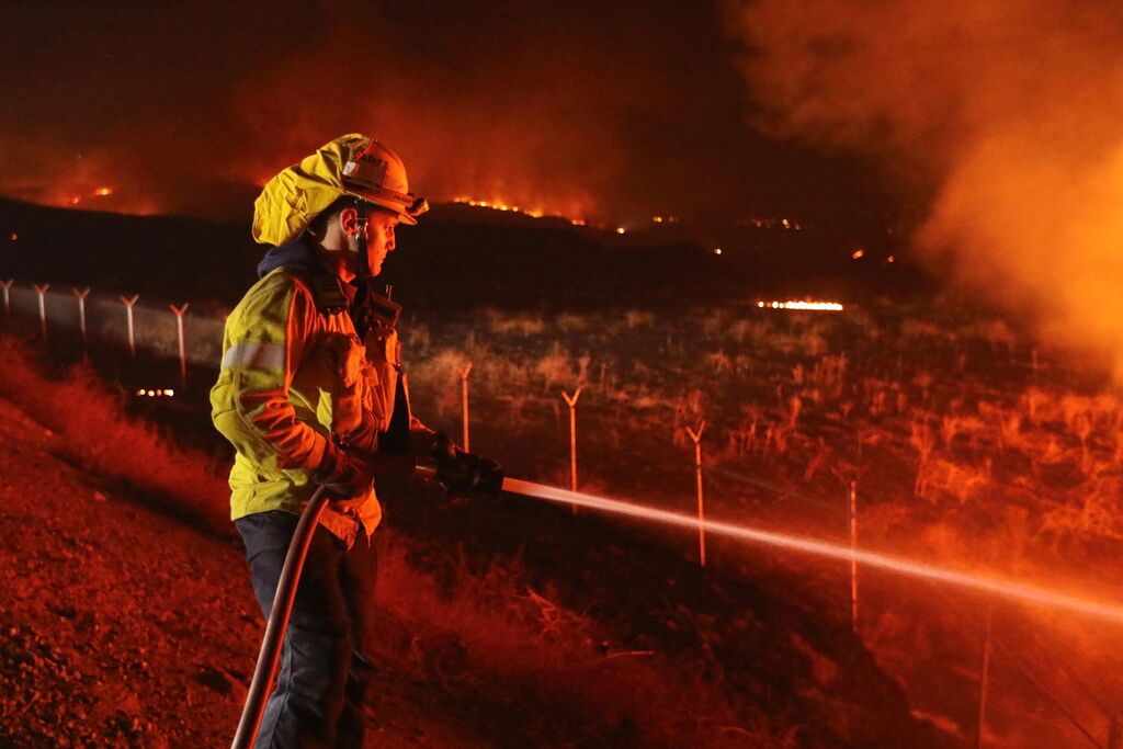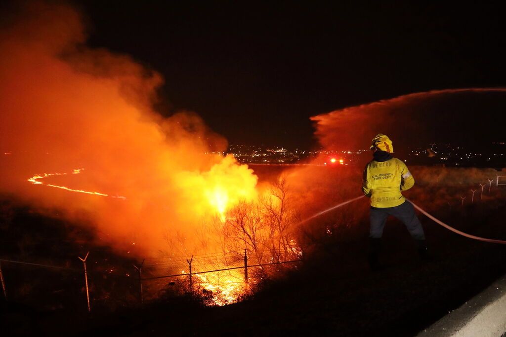 隨著山火逼近,美國(guó)西部主要南北干道5號(hào)州際公路途經(jīng)格雷普韋恩地區(qū)的一段48公里長(zhǎng)路段已禁止通行。多架消防直升機(jī)和消防飛機(jī)從空中噴灑阻燃劑和水,洛杉磯縣、加州多個(gè)部門同時(shí)派消防員實(shí)施地面作業(yè)。
