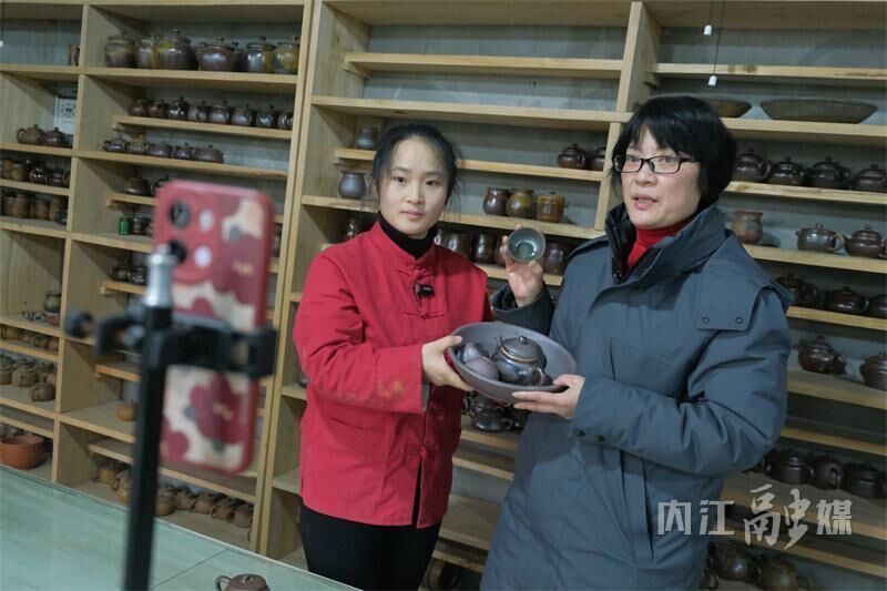 1月17日,內(nèi)江市隆昌市圣燈鎮(zhèn)梨園村利民土陶加工坊,在隆昌農(nóng)商行東區(qū)支行工作的鄭常蘭正在手機前與網(wǎng)友們互動。